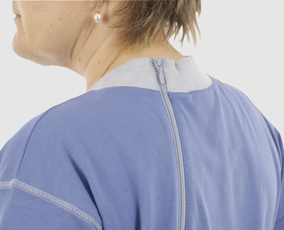 Der lange Rückenreißverschluss unterstützt ein schonendes An- und Ausziehen und verhindert gleichzeitig, dass Pflegebedürftige den Overall selbstständig öffnen. Dadurch bleibt das Inkontinenzmaterial sicher an Ort und Stelle.