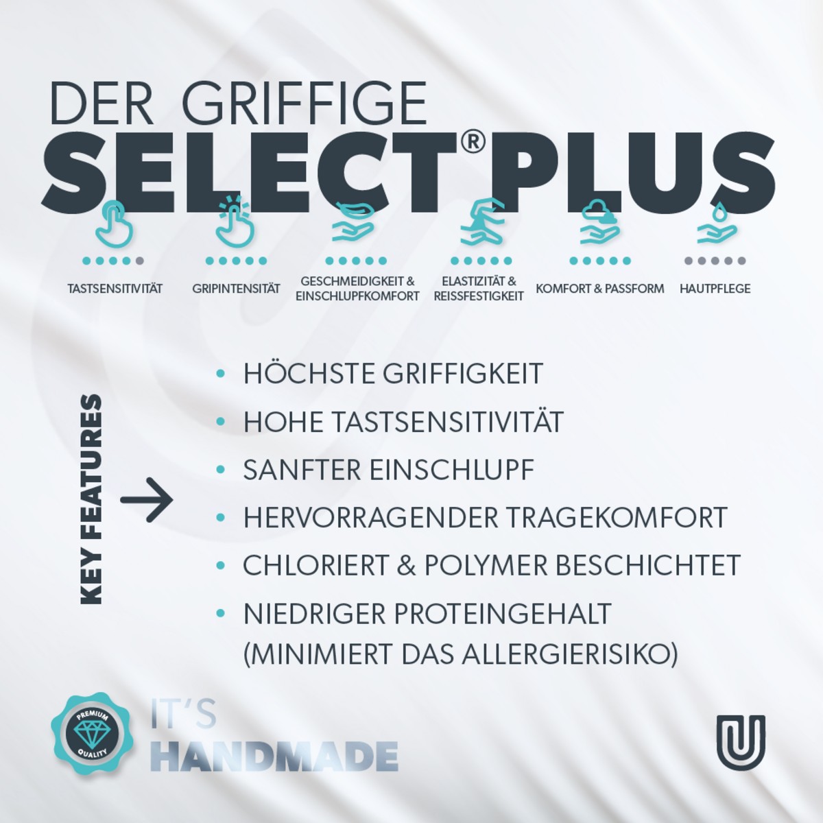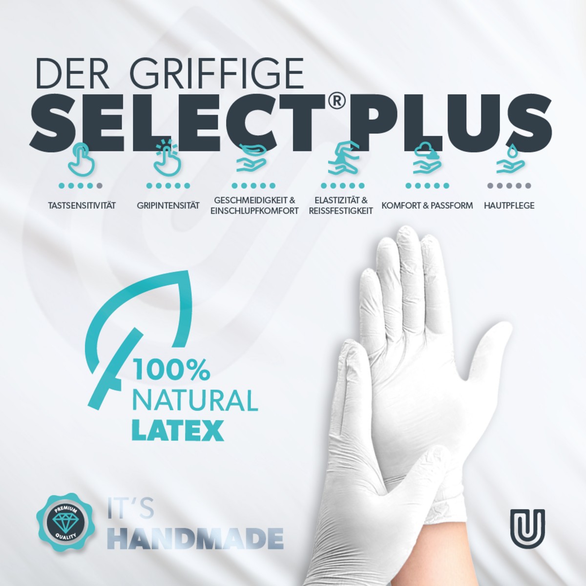 Dank der besonders weichen Latexqualität ermöglichen Select Plus ein exzellentes Feingefühl und präzise Handhabung von Instrumenten und Materialien. Die hohe Flexibilität sorgt für ein natürliches Tragegefühl.
